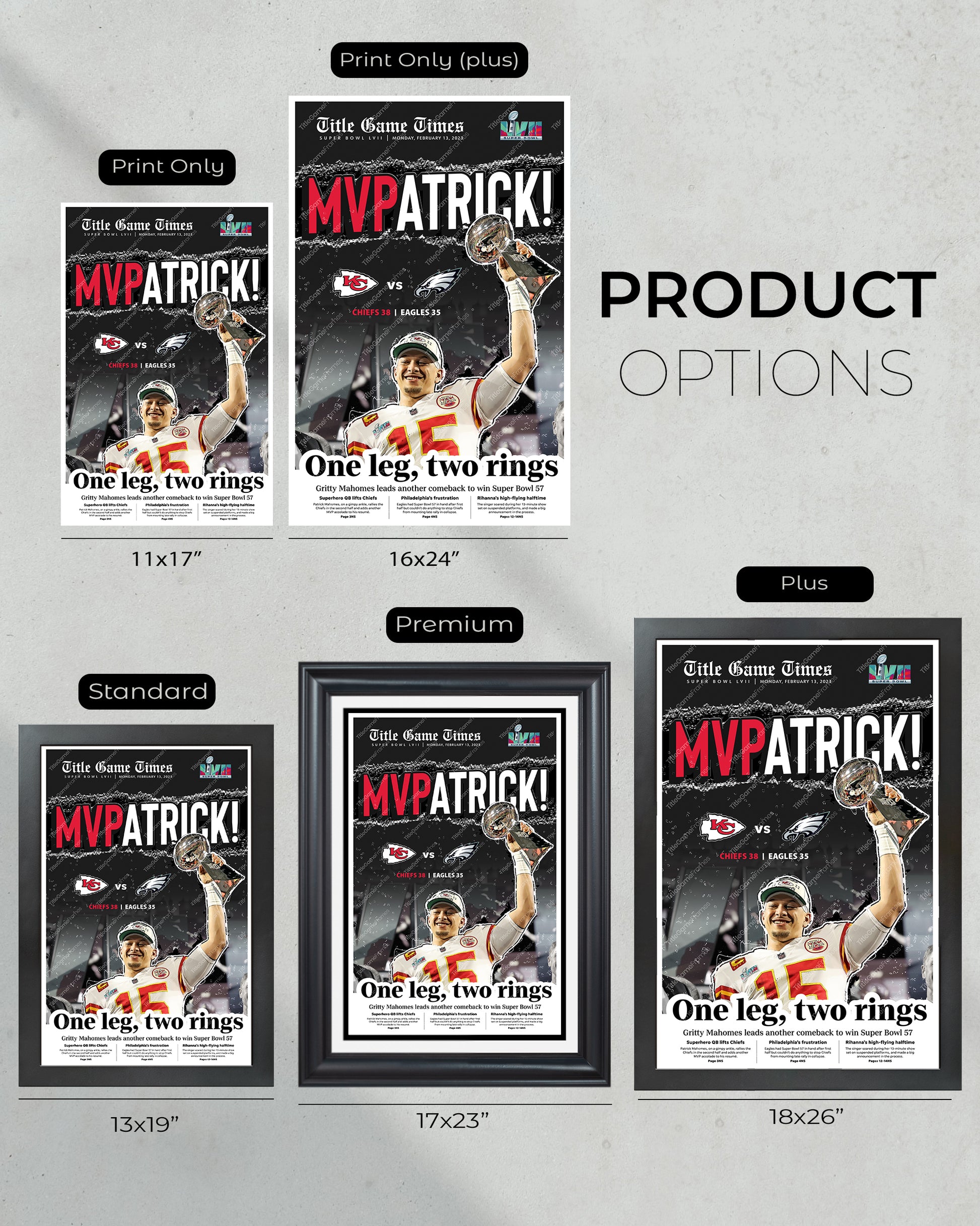 MVPatrick! Get your special edition, Title Game Times, framed commemorative front page newspaper celebrating the Kansas City Chiefs victory against the Philadelphia Eagles in Super Bowl LVII 2023. Kansas City Chiefs quarterback Patrick Mahomes named Super Bowl 57 MVP.
