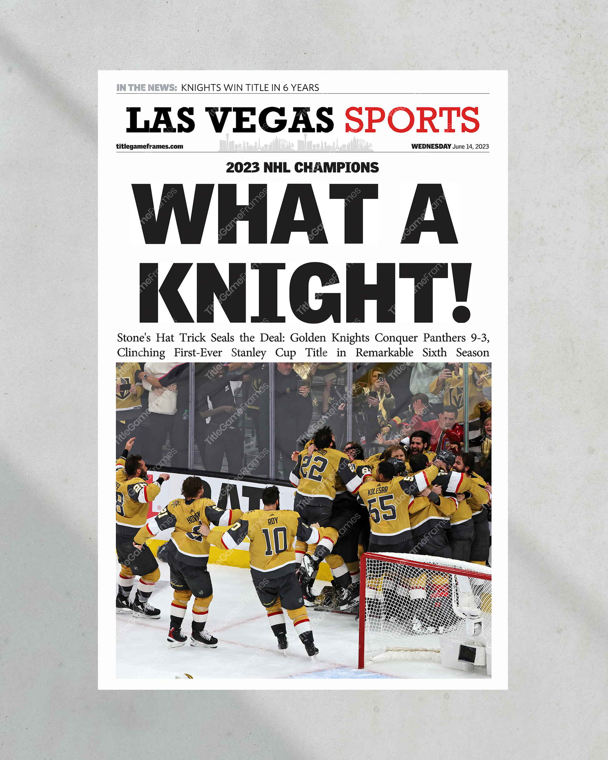 Experience the glory of the Vegas Golden Knights' landmark victory with our 2023 Stanley Cup Champions Framed Newspaper Print. A thrilling culmination of six years of hard work, the Knights trounced the Florida Panthers with a 9-3 win, captivating the packed T-Mobile Arena and fans across the globe.